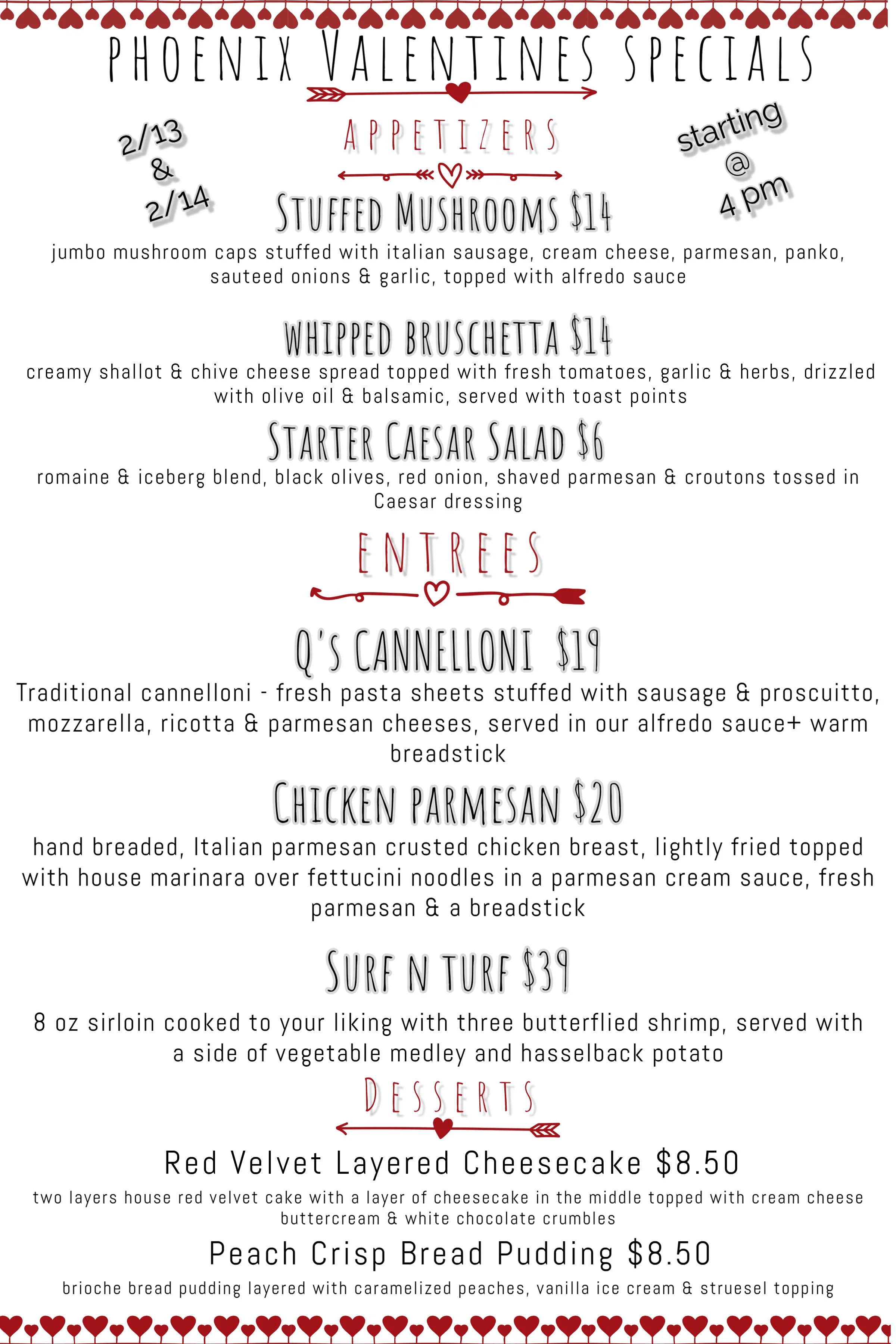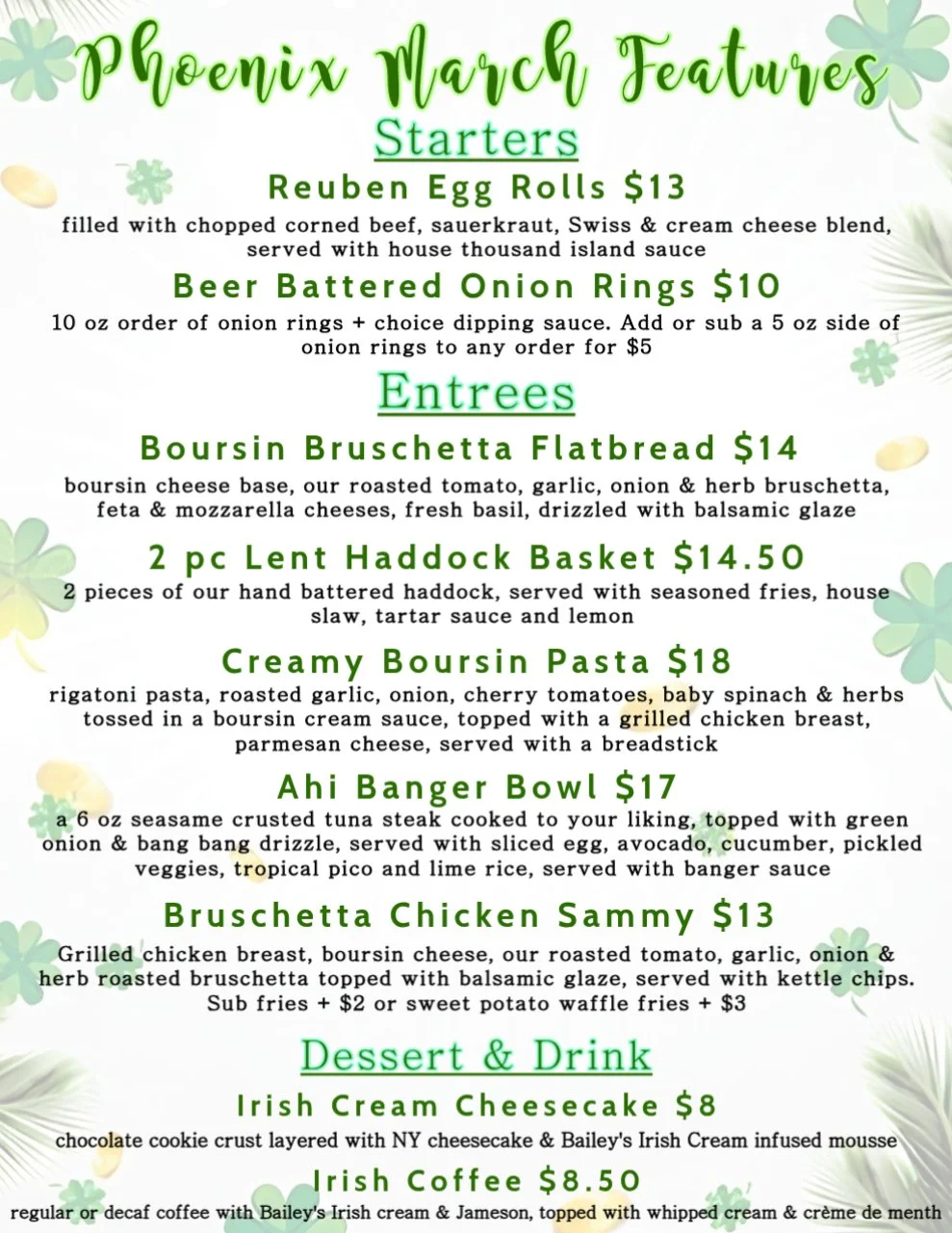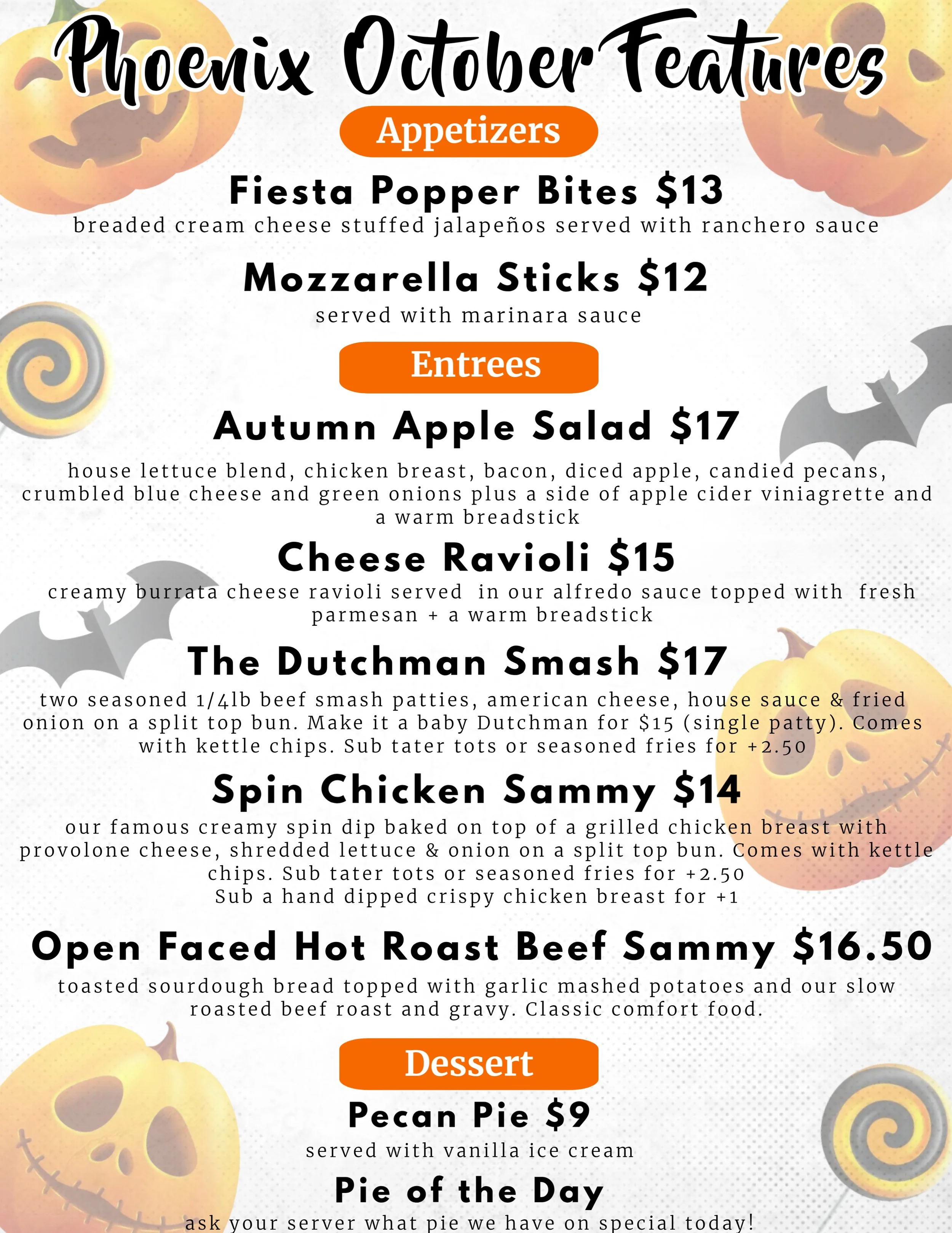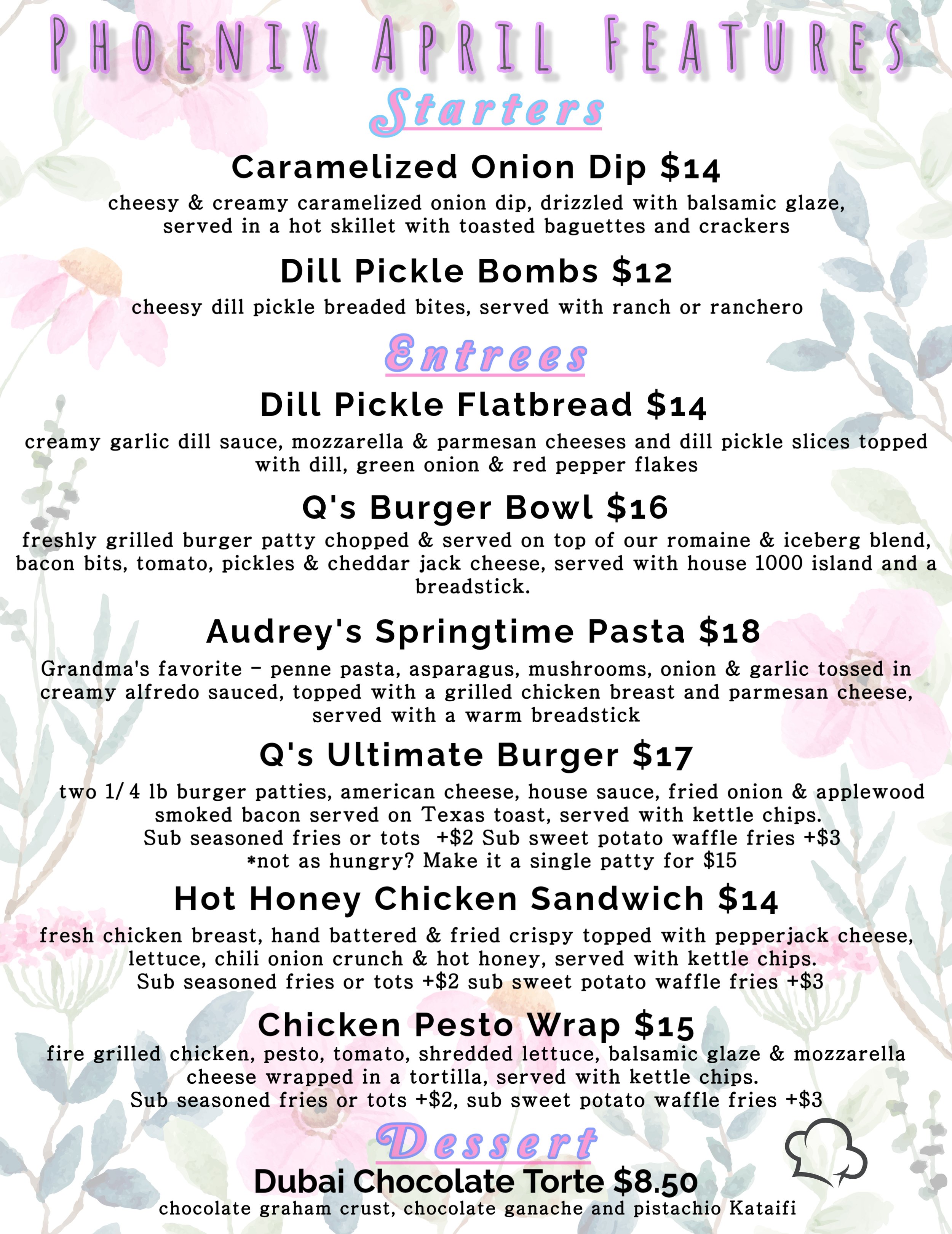 New monthly feature menus, available all month long in addition to our regular menu!